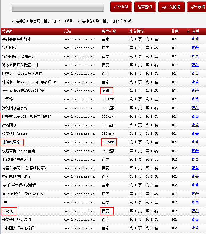 假如首页有 5个关键词,我们来搜索4个搜索引擎的排名状况,每个搜索引擎有20页,我们要操作的动作就是:5*4*20=400;我们有 20个关键词,那就是还多了 4倍:5*4*20*4=1600 就是说,我们要做 1600次的操作才能了解到这 20个词在4大搜索引擎的排名状况,而且还不包含在这过程中的记录备份的工作。